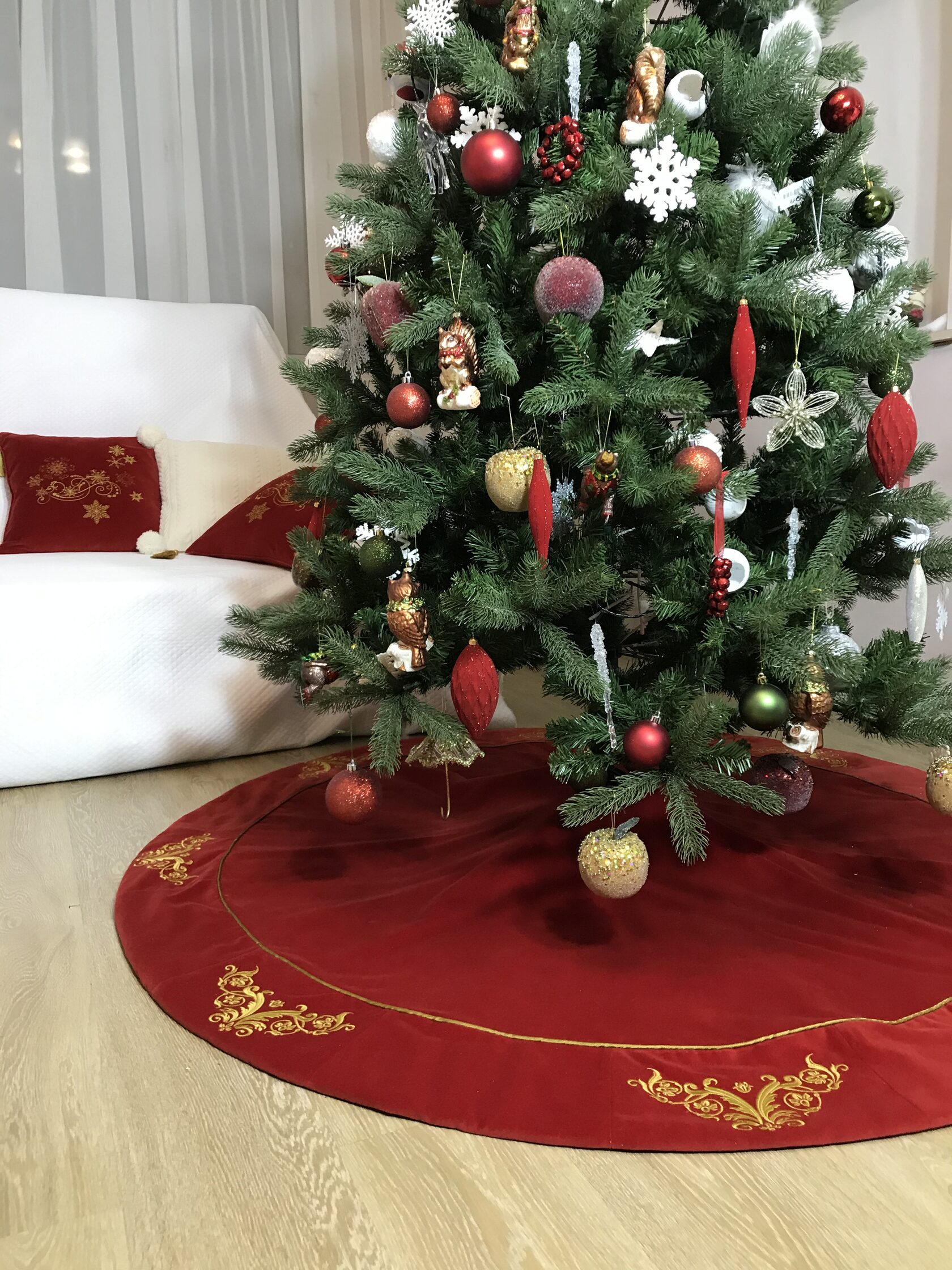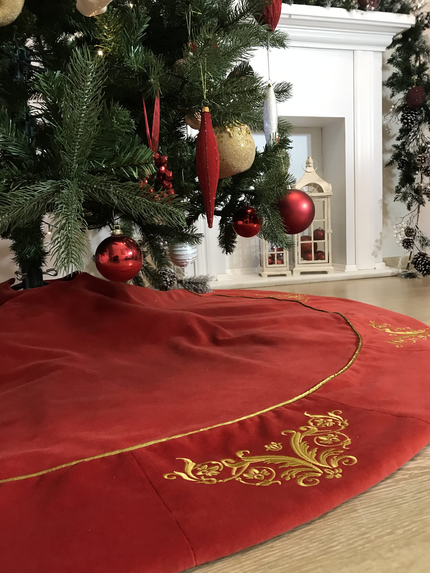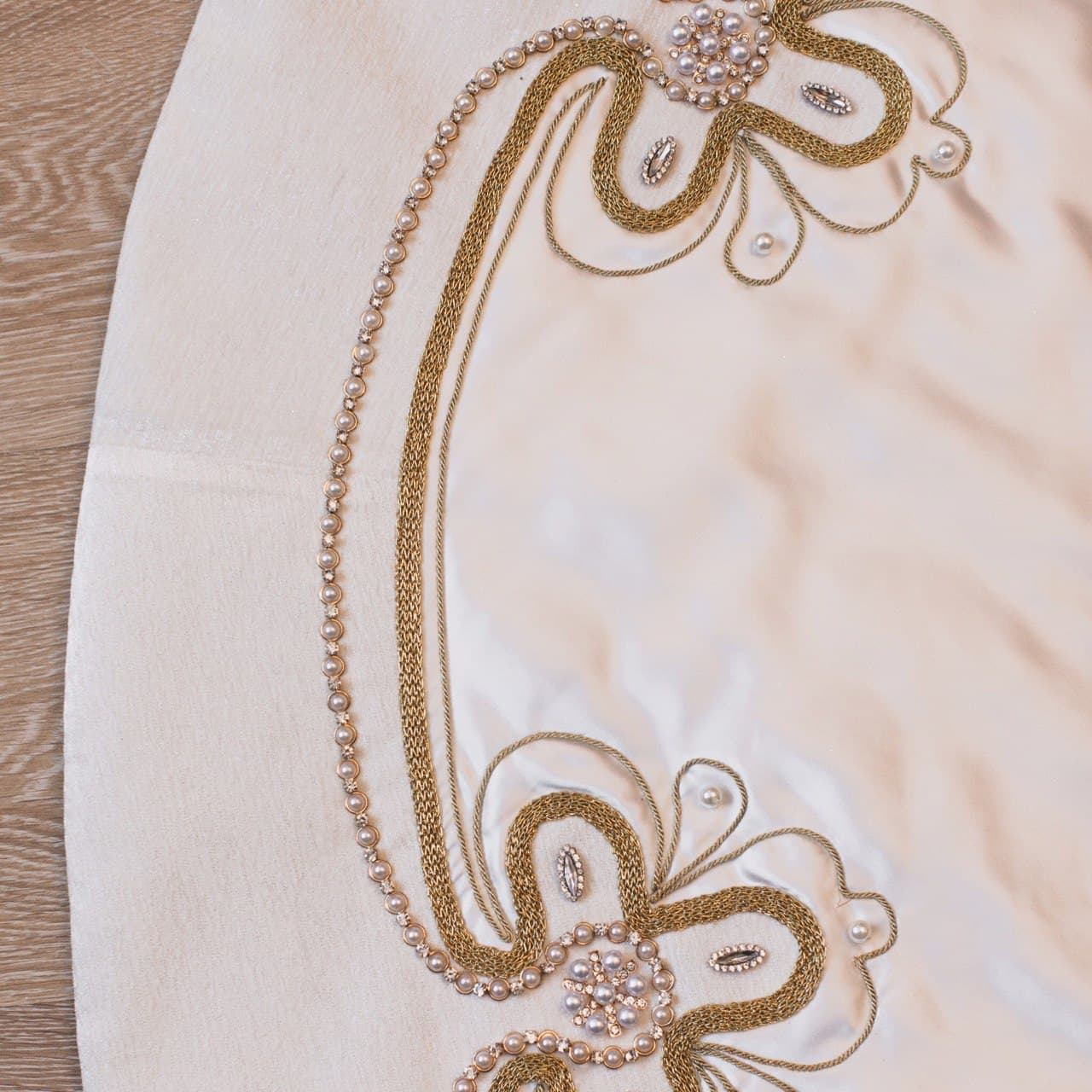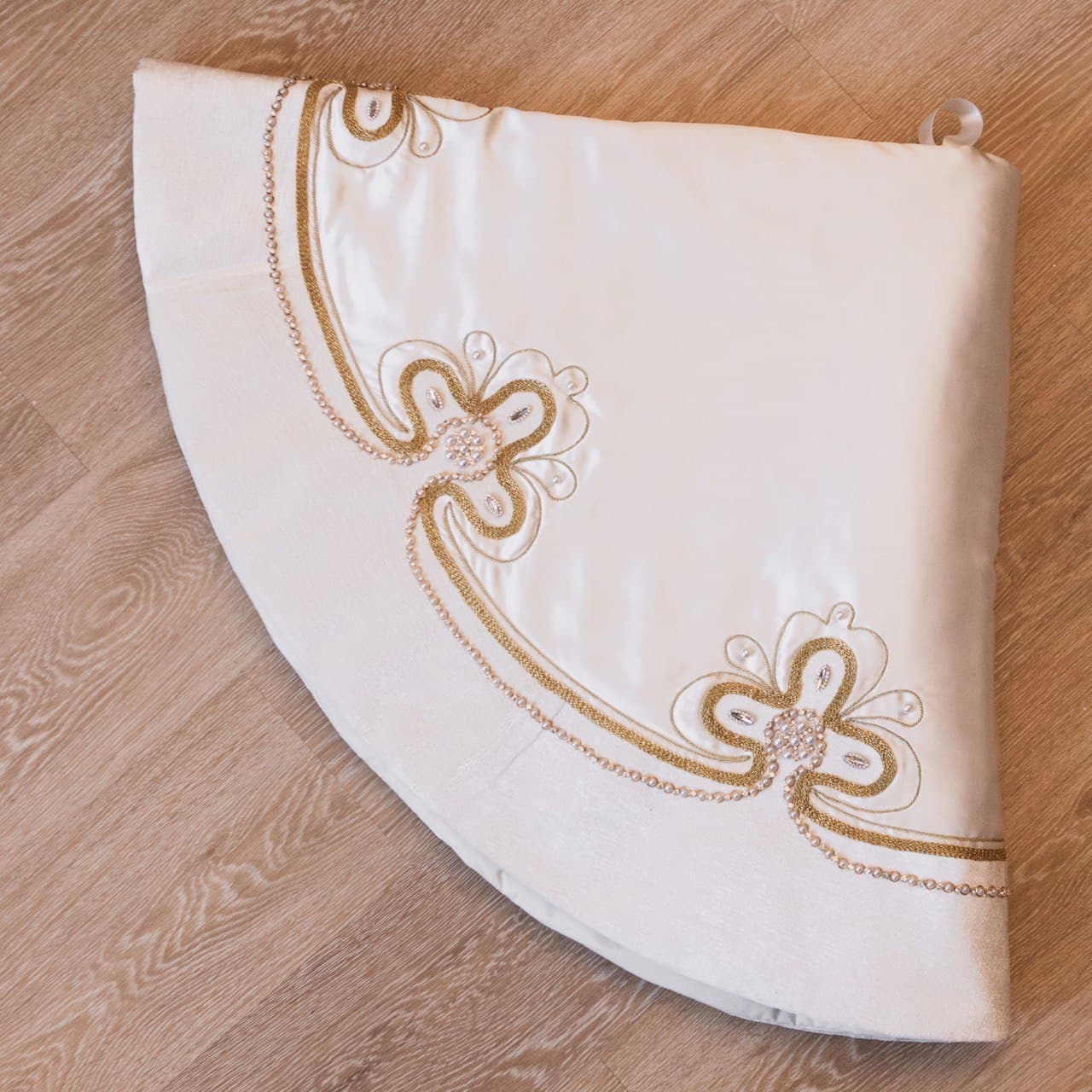 D135 см Белая атласная юбка под елку с бархатной каймой Вышивка шнуром Камни, стразы, жемчужины Ручная вышивка На подкладке, с наполнителем. За счет этого хорошо держит объем С такой юбочкой ваша елка-королева!
