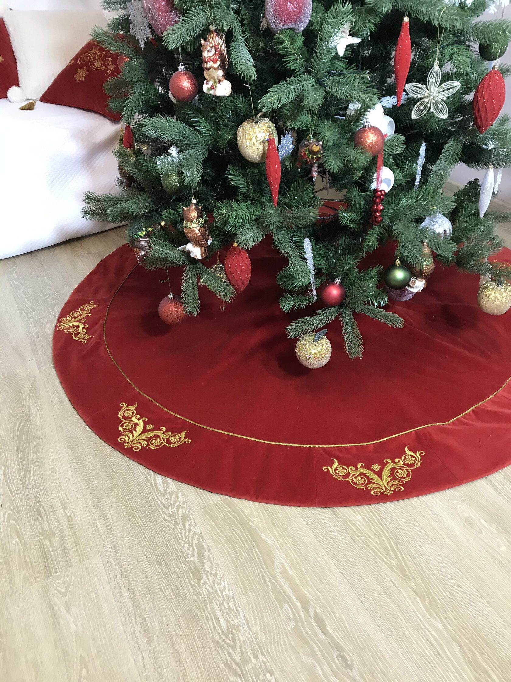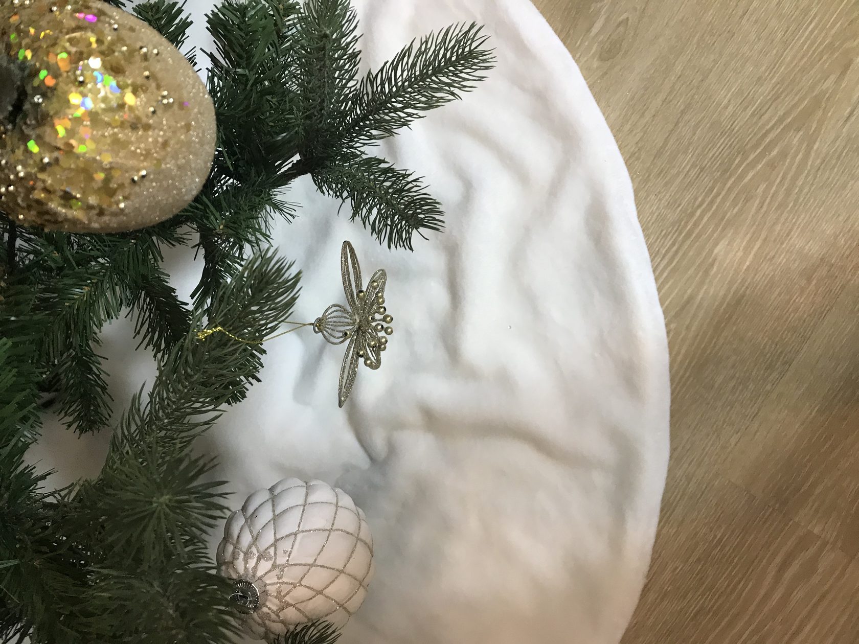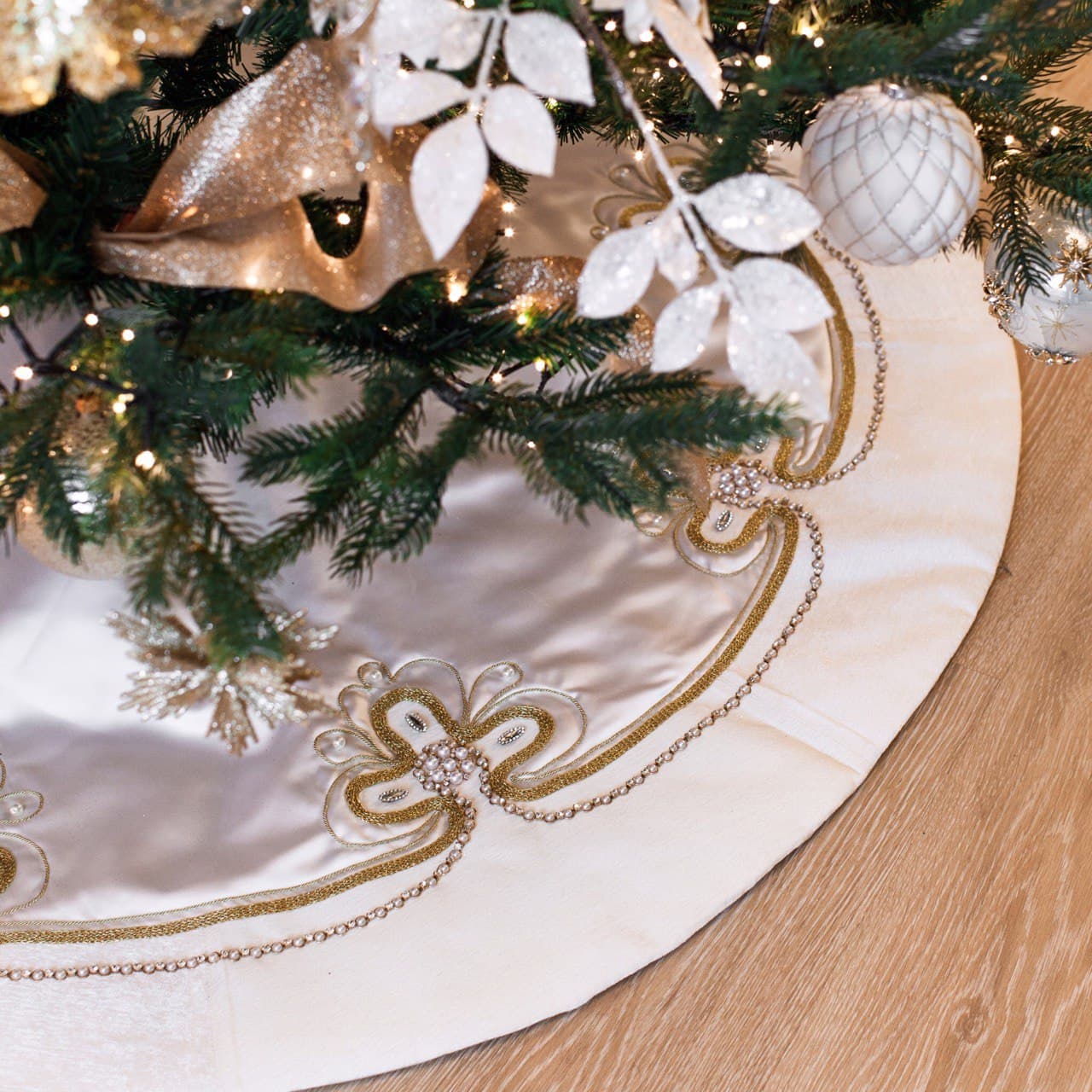 D135 см Белая атласная юбка под елку с бархатной каймой Вышивка шнуром Камни, стразы, жемчужины Ручная вышивка На подкладке, с наполнителем. За счет этого хорошо держит объем С такой юбочкой ваша елка-королева!