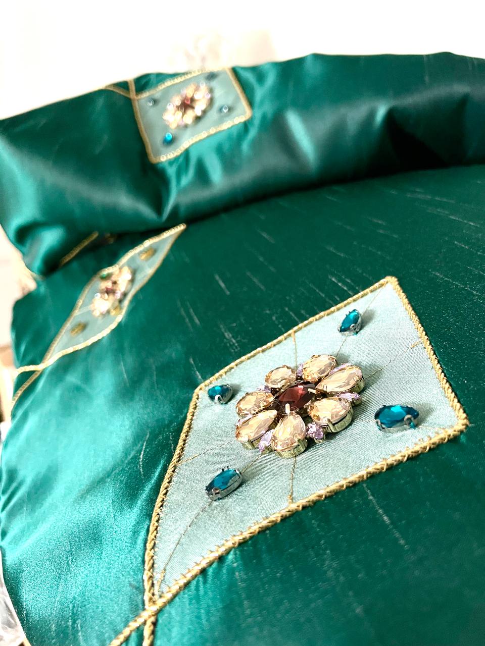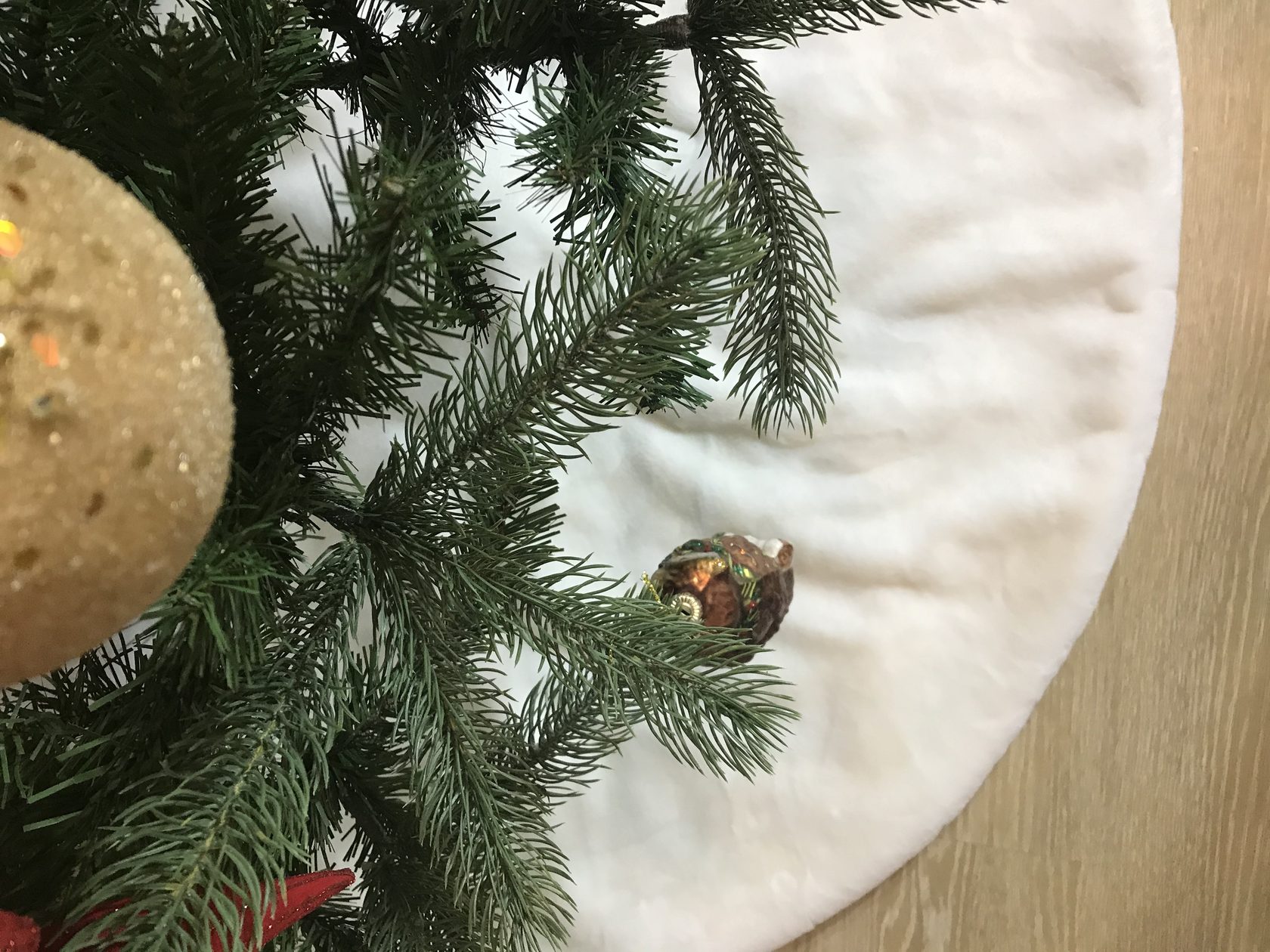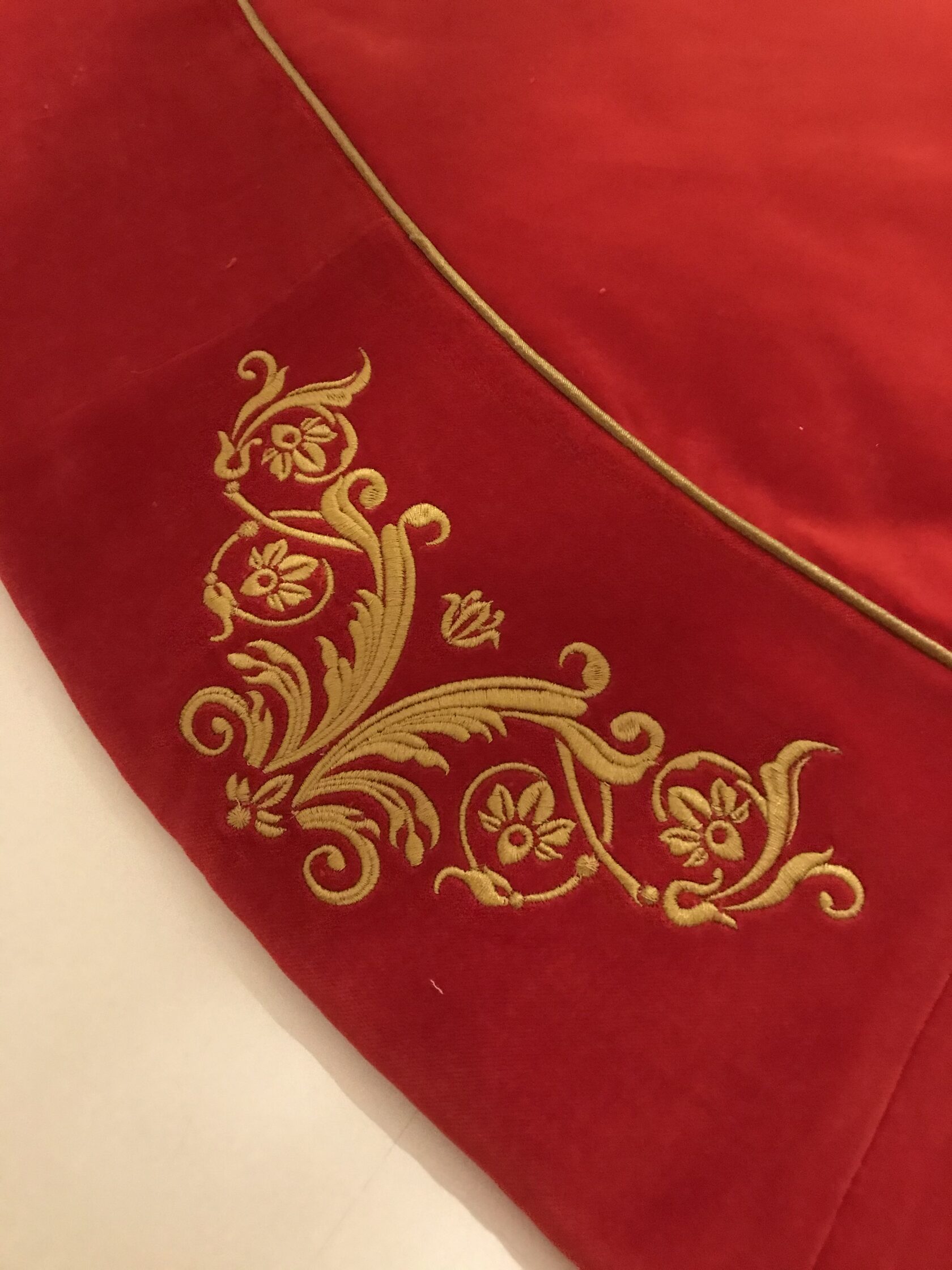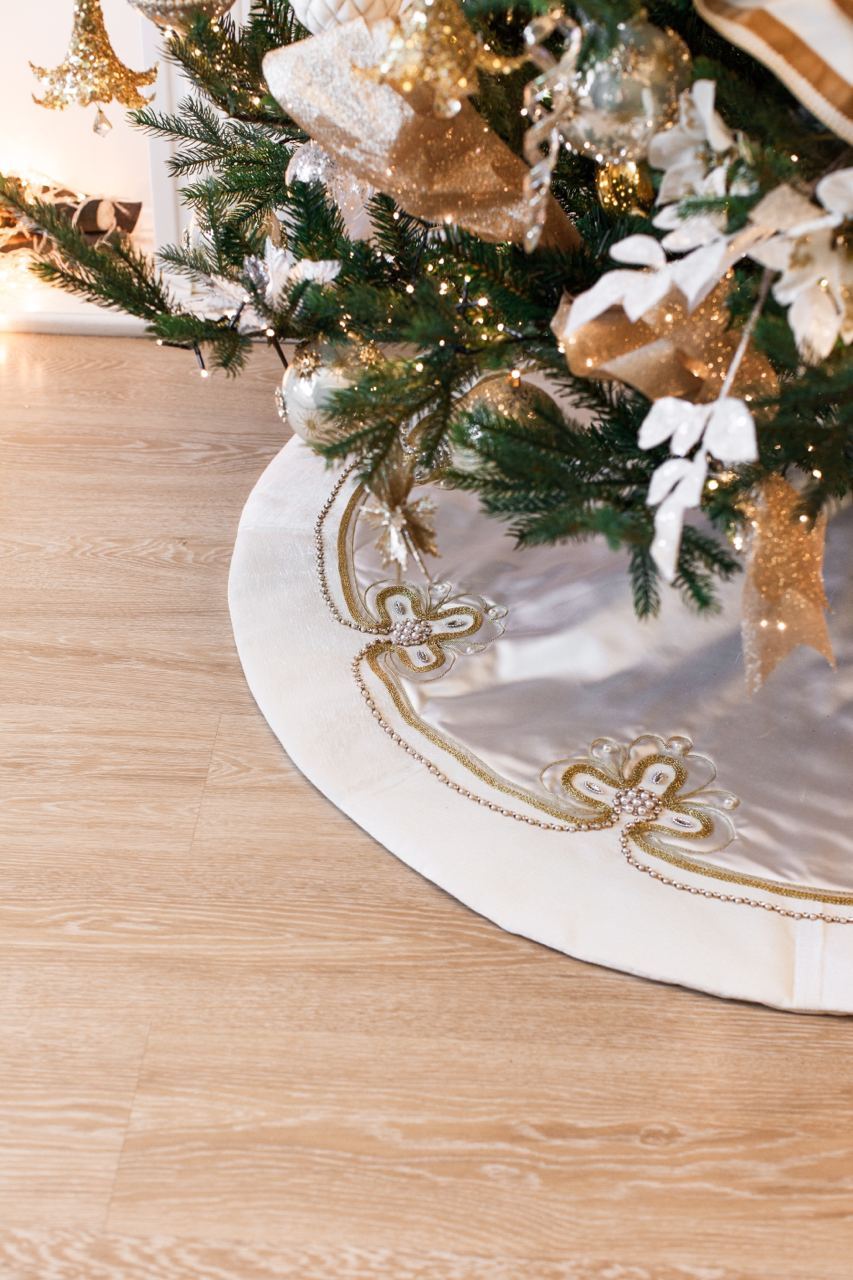 D135 см Белая атласная юбка под елку с бархатной каймой Вышивка шнуром Камни, стразы, жемчужины Ручная вышивка На подкладке, с наполнителем. За счет этого хорошо держит объем С такой юбочкой ваша елка-королева!