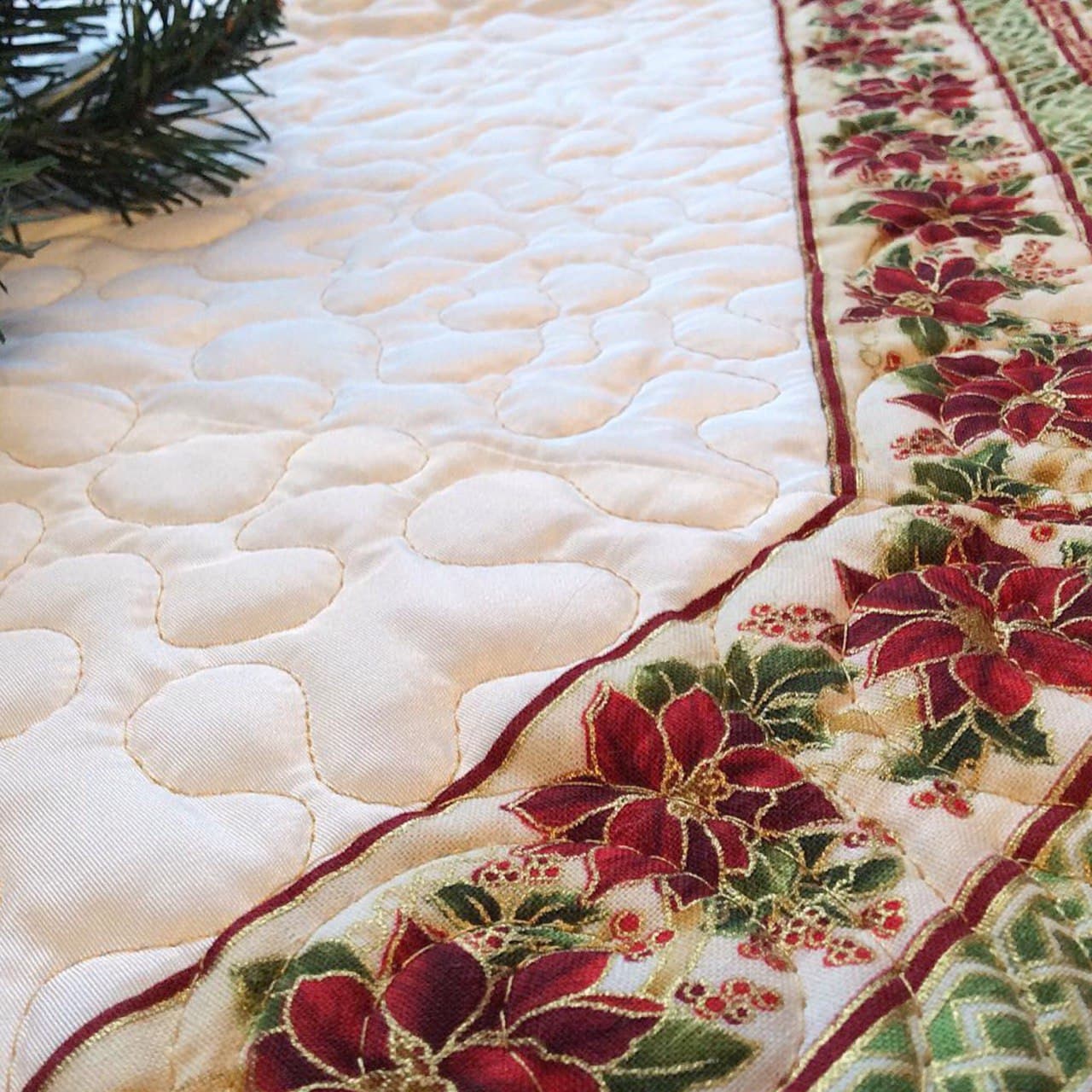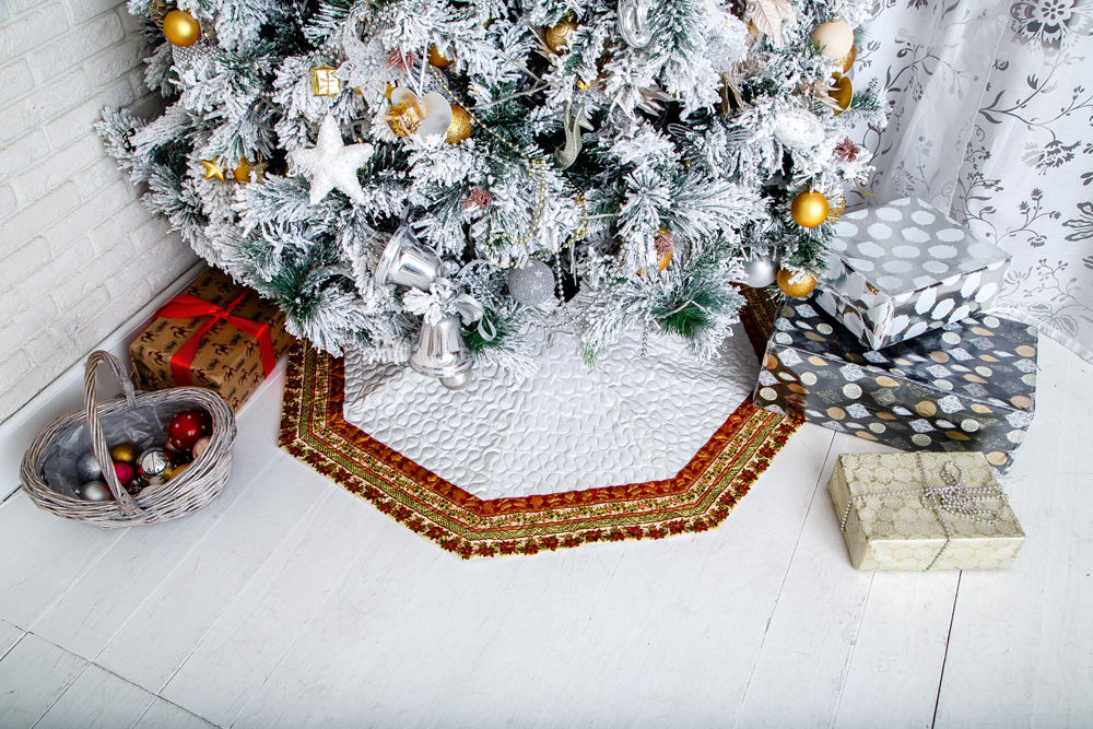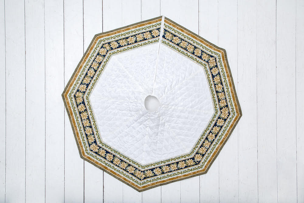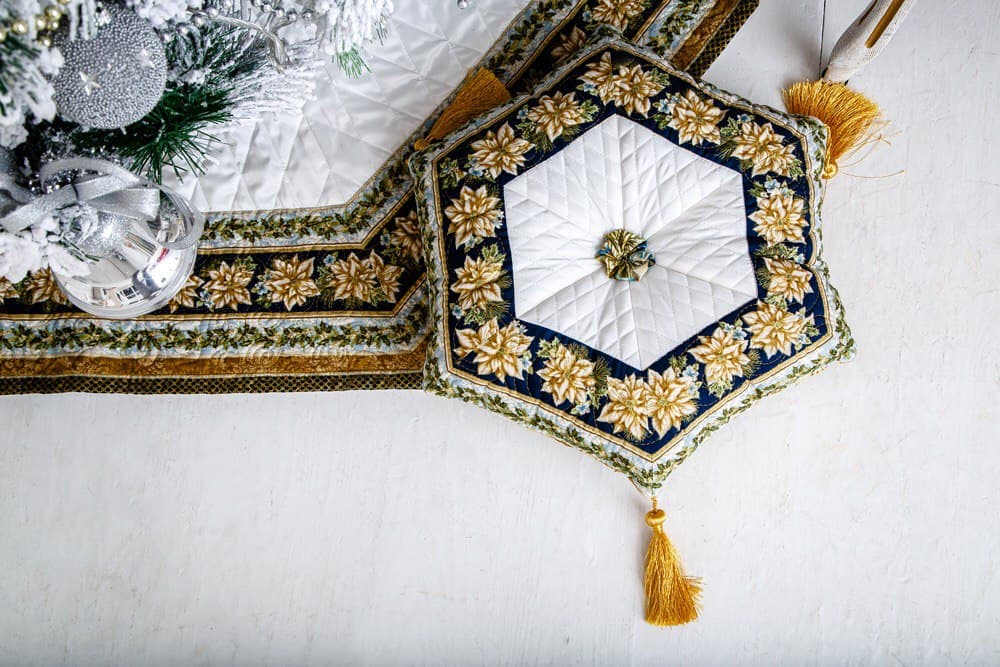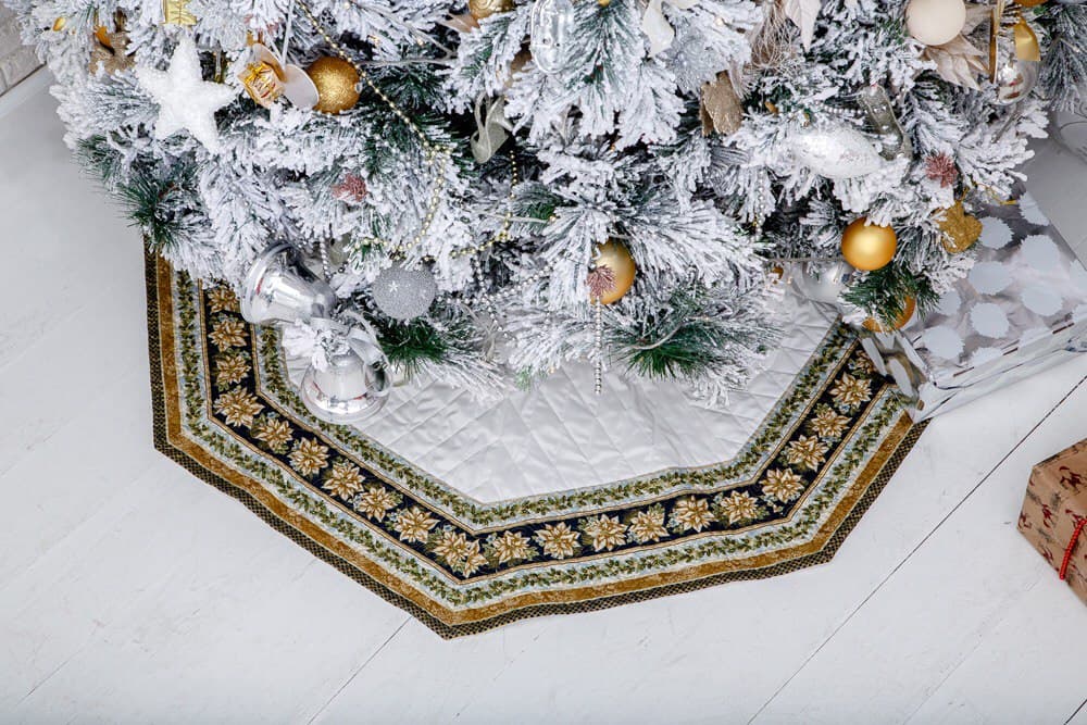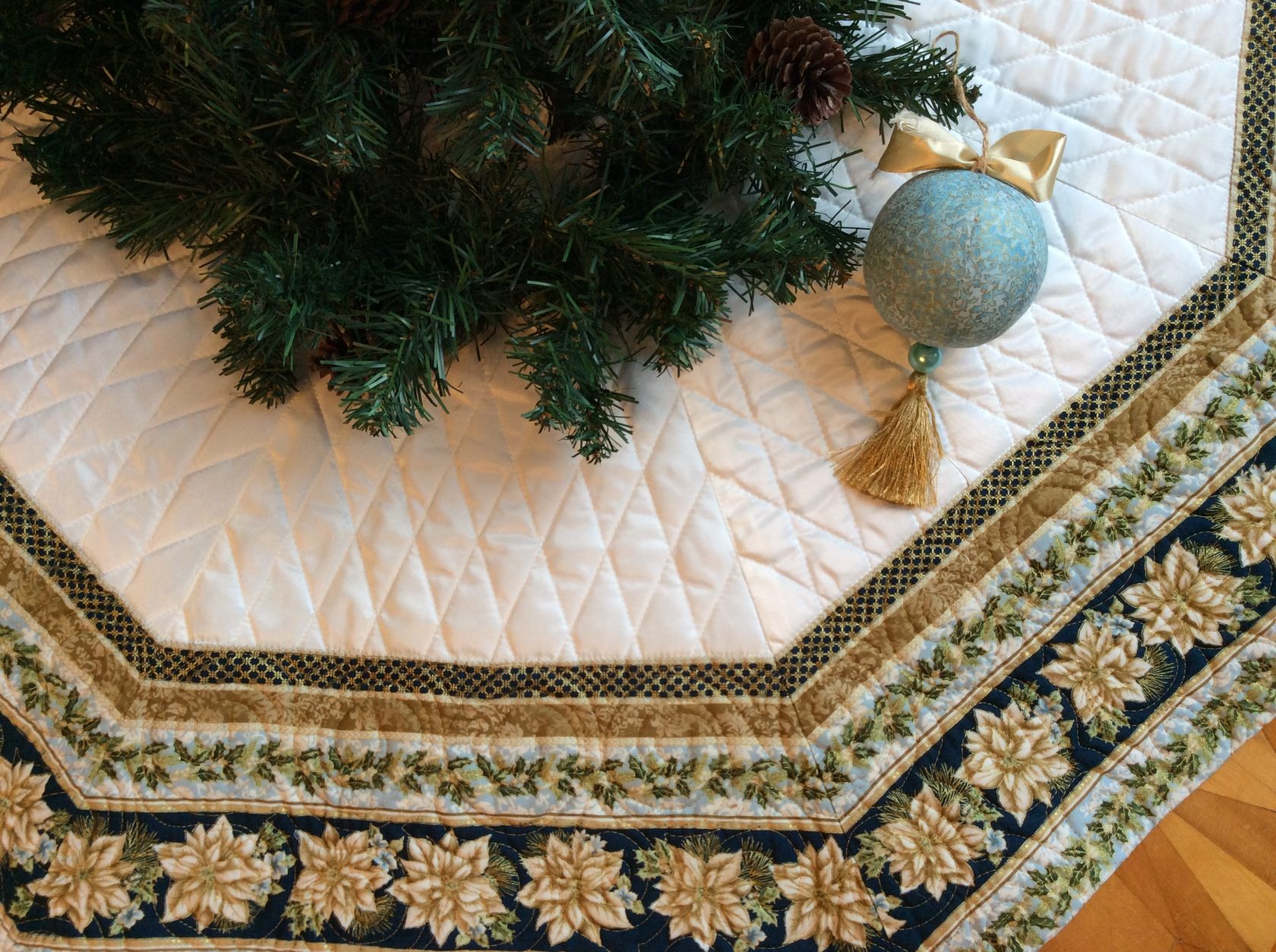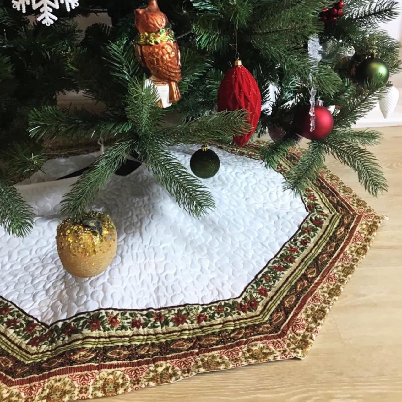 Белая юбка под елку с каймой из японского хлопка с золотым глиттером. Цвет пуансеттий-синий. На подкладке с наполнителем, по всей поверхности художественная стежка. Хорошо держит форму под елкой. D-100см-7900р D-120см-8700р
