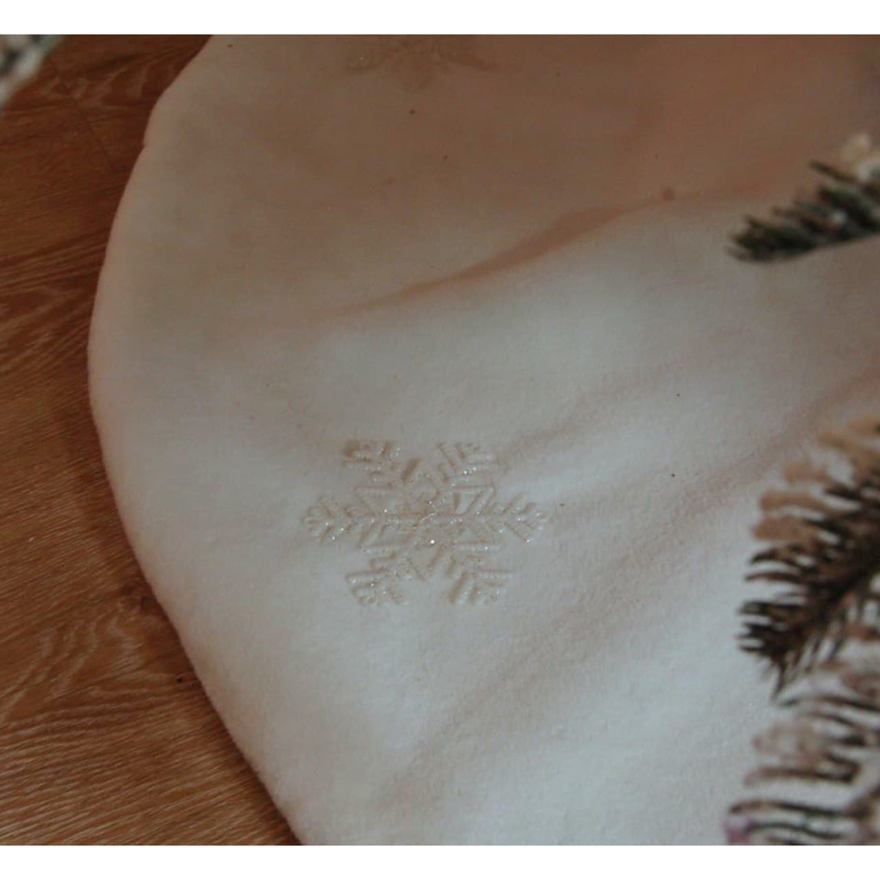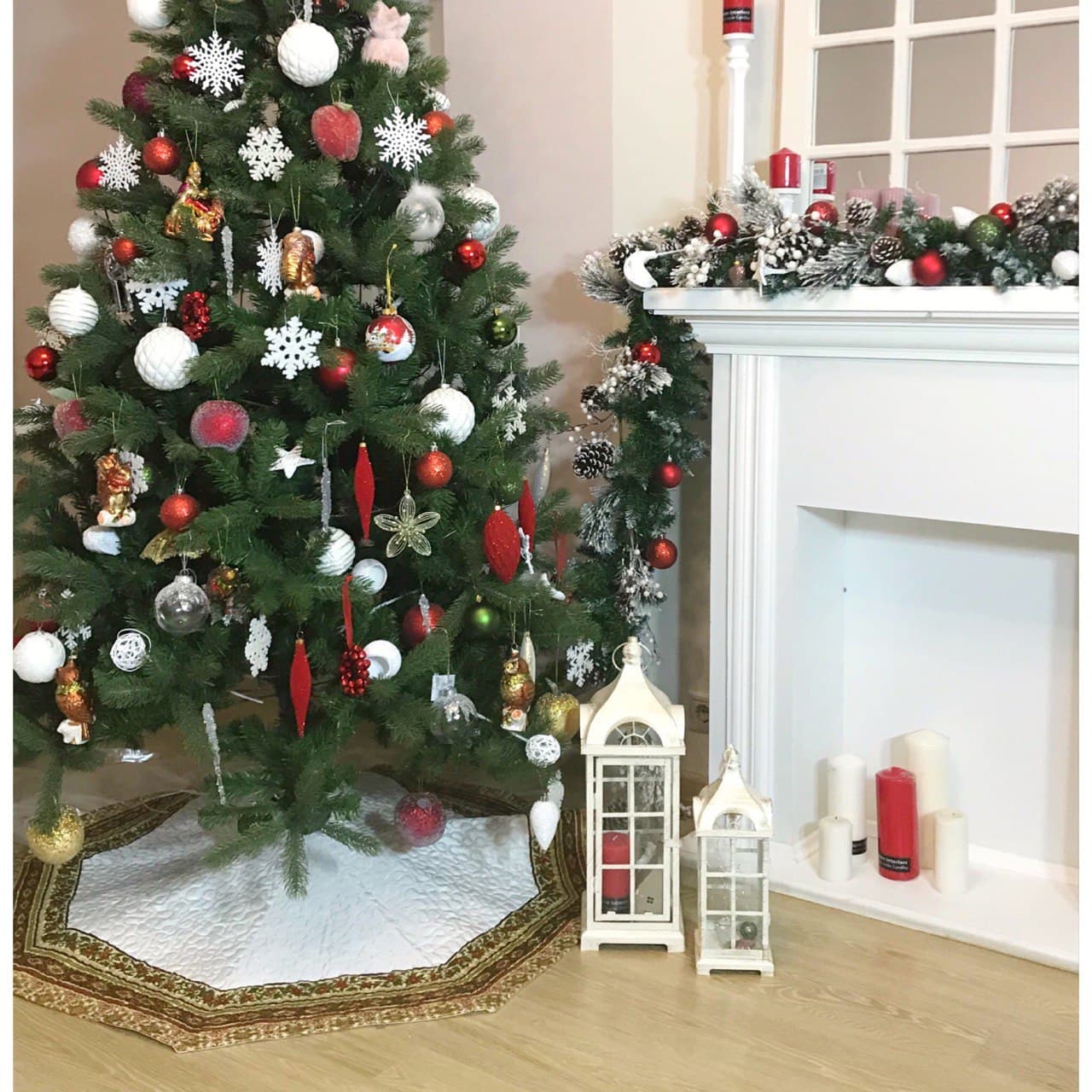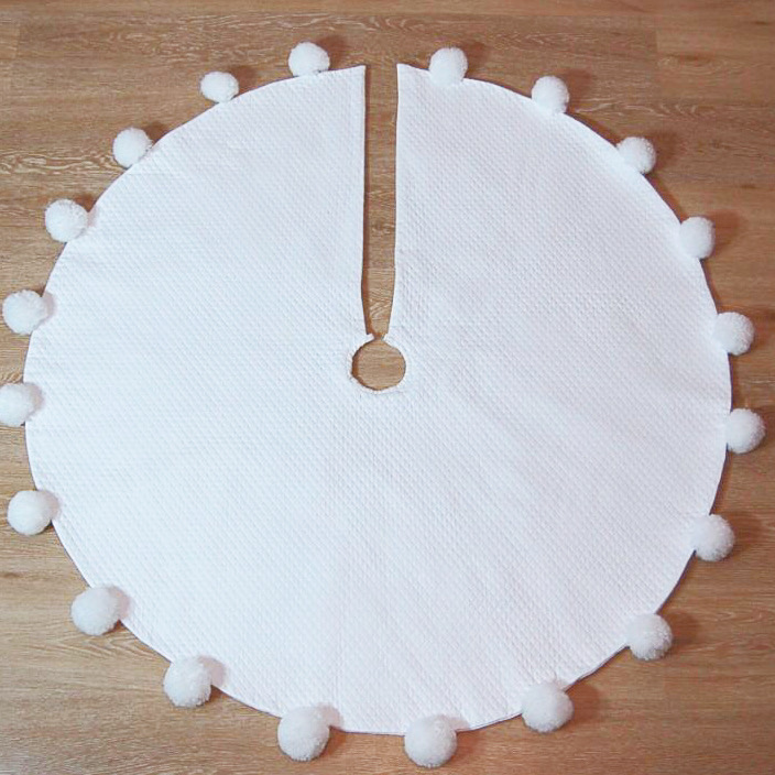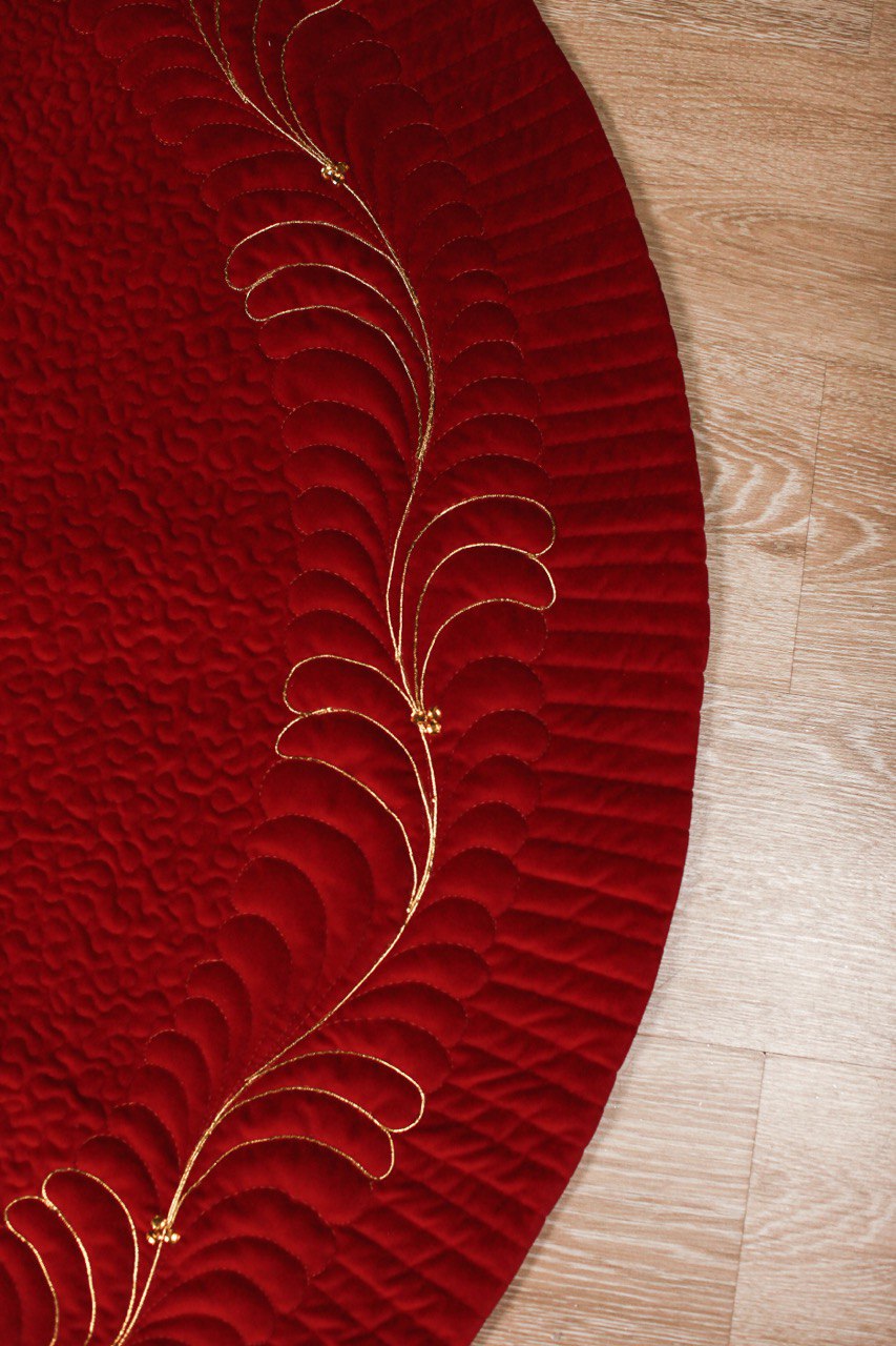Итальянский плотный хлопок со стежкой На подкладке С наполнителем -отлично держит форму, не комкается под елкой. По всему внешнему краю расположены большие пушистые помпоны. Диаметр 135см (без учета помпонов)