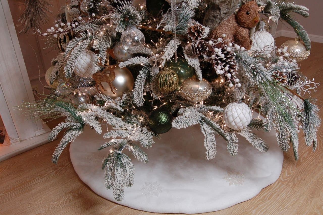 Очень нежный, мягкий мех, густой, похож на стриженую норку. Юбка на подкладке, с наполнителем Пышная, объемная, хорошо держит форму. Под елочкой смотрится снежным сугробом. По всему краю юбки расположены белые блестящие снежинки D 100см-9700р D 120см-10600р D150см-12300р