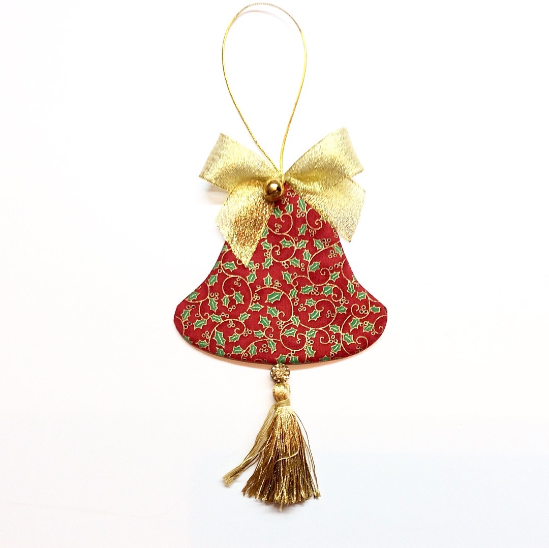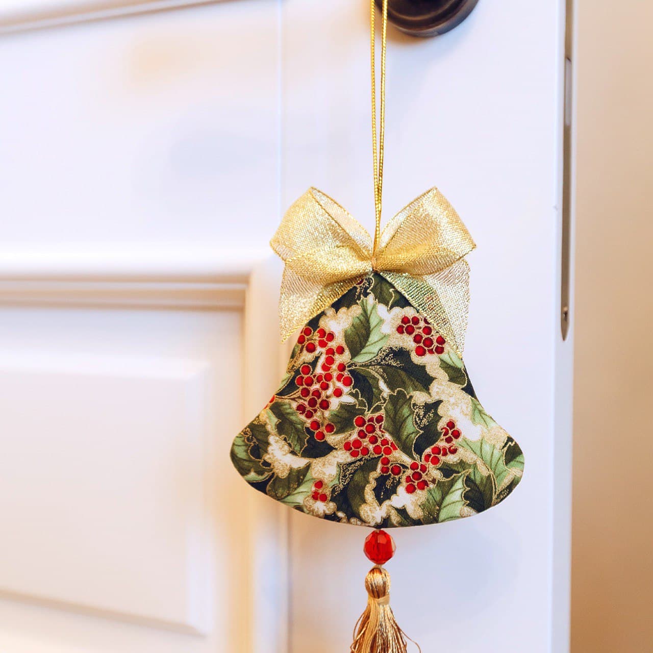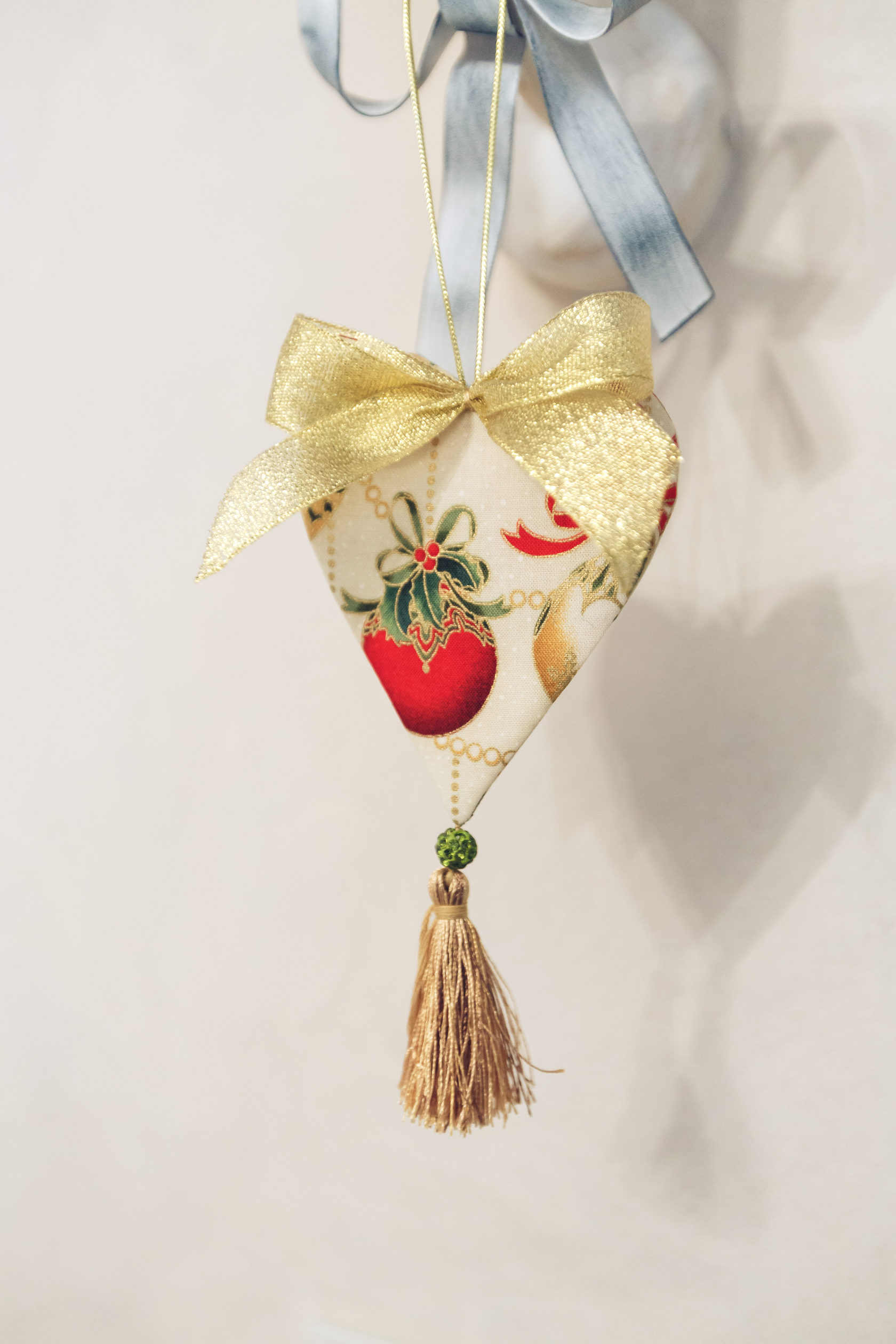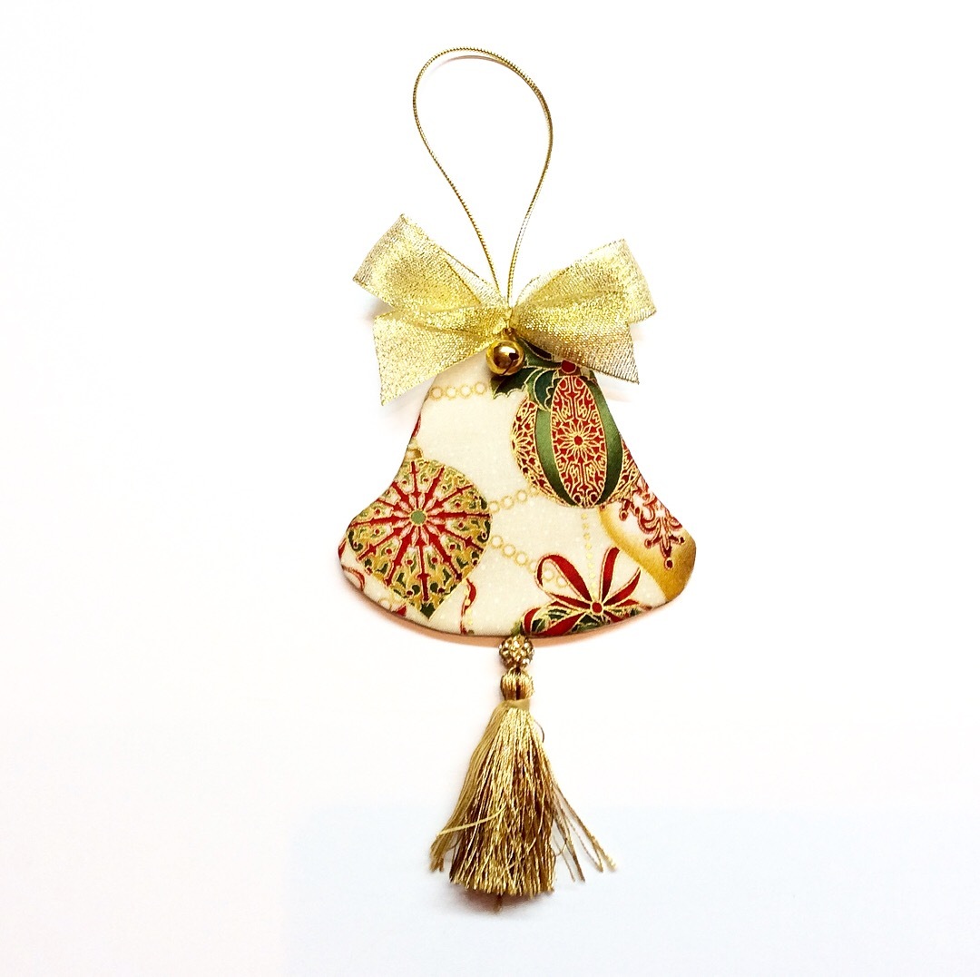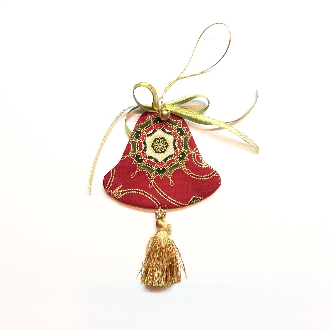 Выполнена из японского хлопка с золотым напылением Украшена: шелковая кисточка, бусина со стразами, колокольчик с лентами Отличное дополнение к Новогоднему декору и в качестве небольшого презента