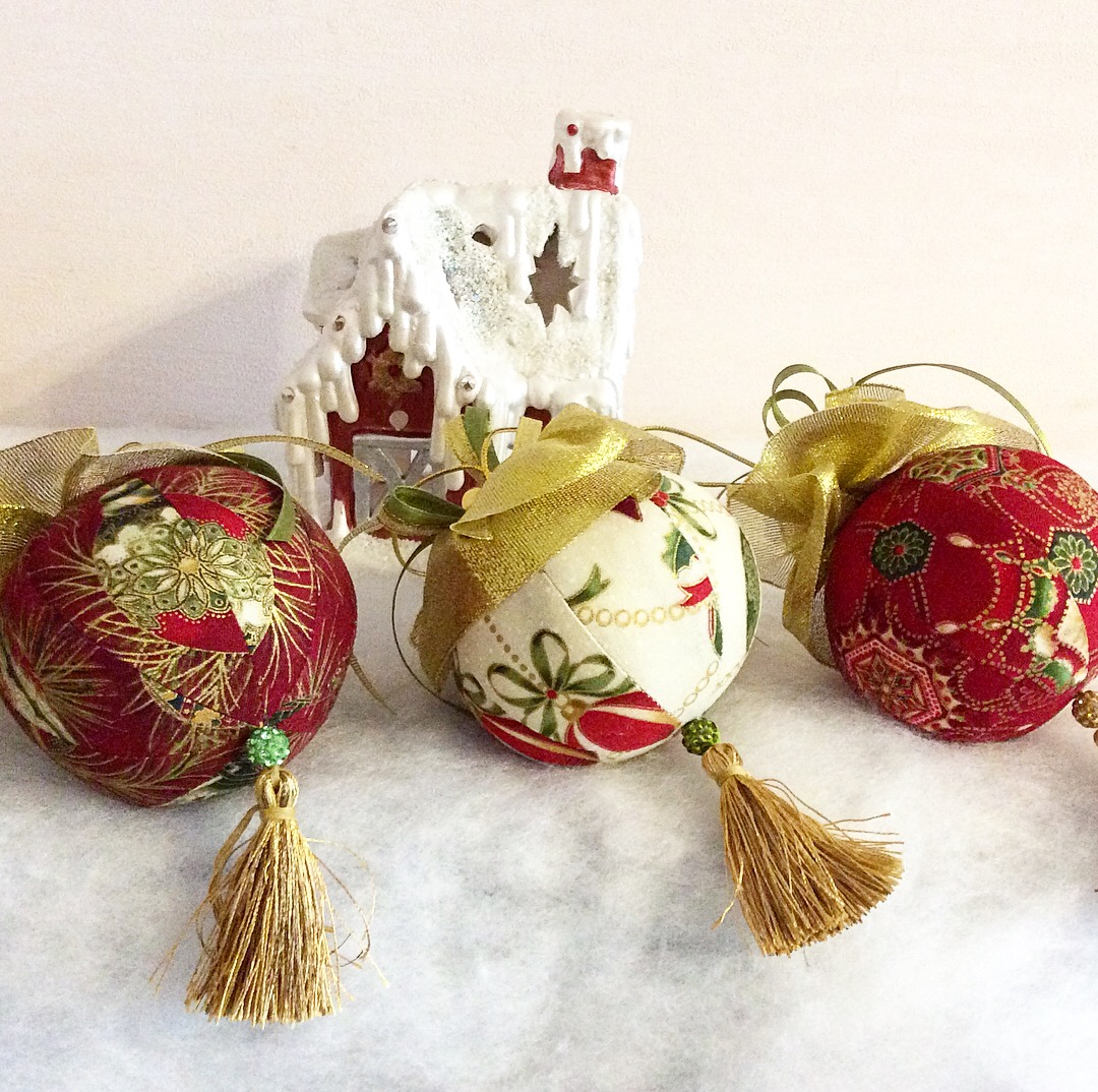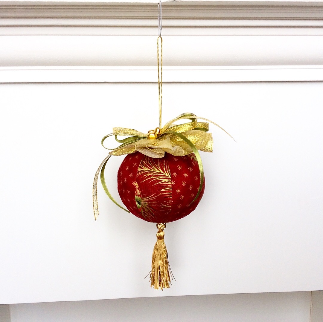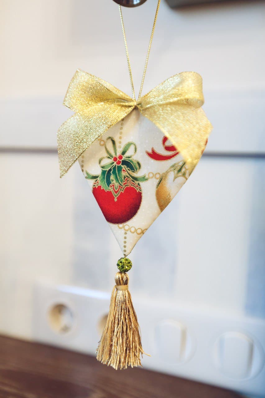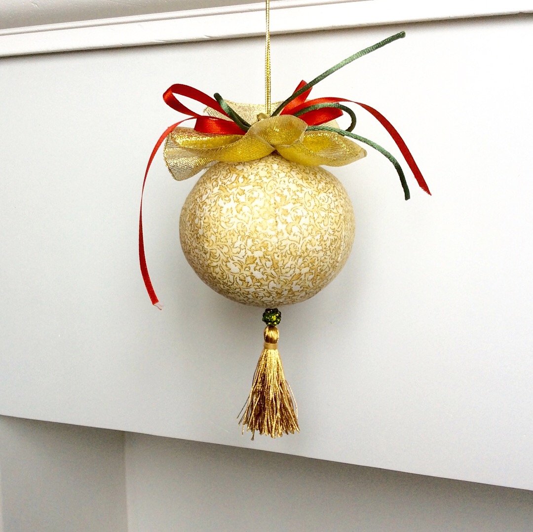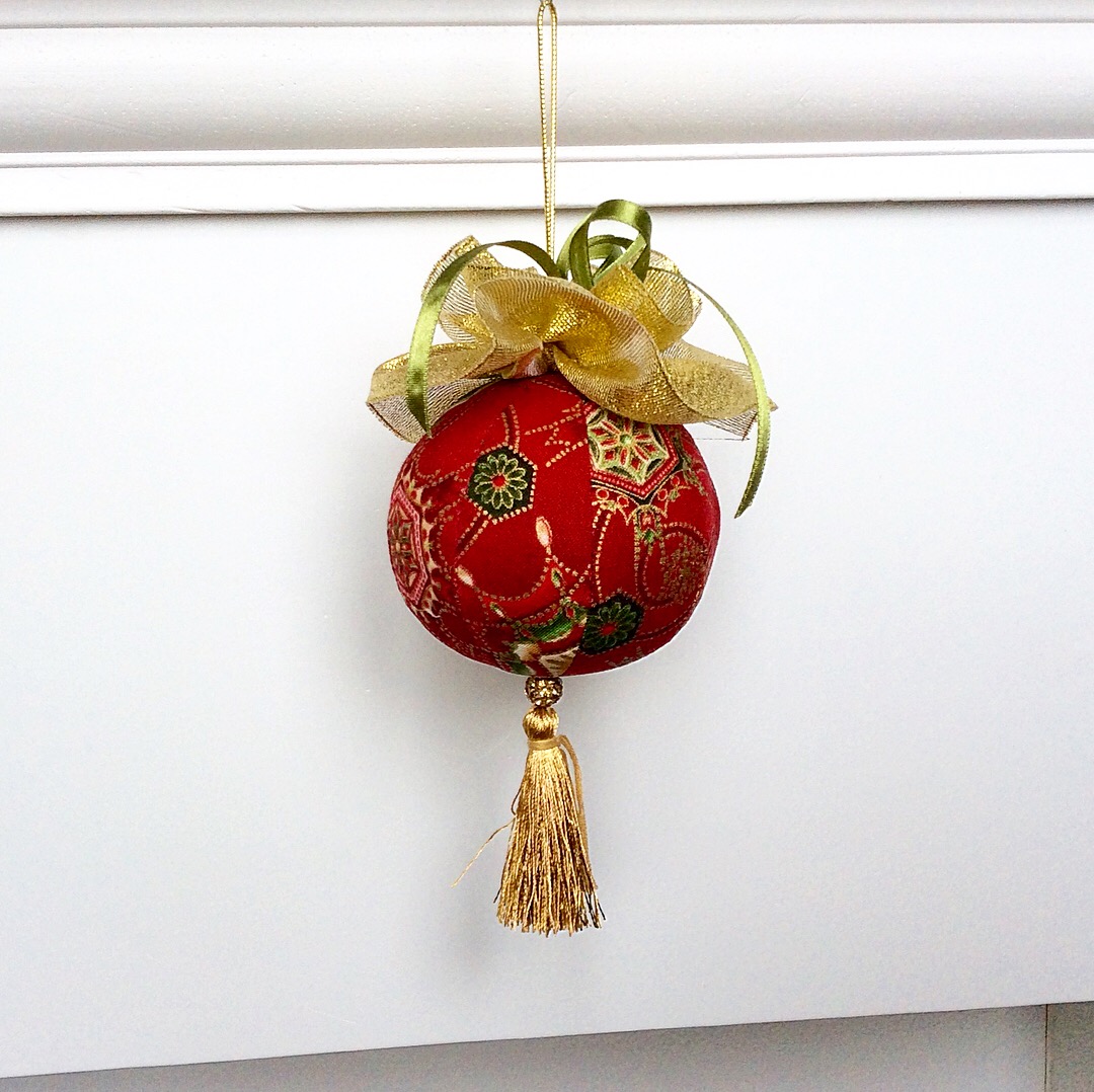 Выполнена из японского хлопка с золотым напылением Украшена: шелковая кисточка, бусина со стразами, колокольчик с лентами Отличное дополнение к Новогоднему декору и в качестве небольшого презента