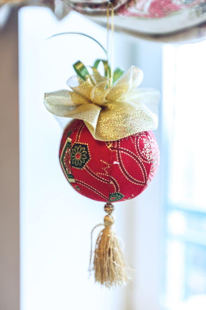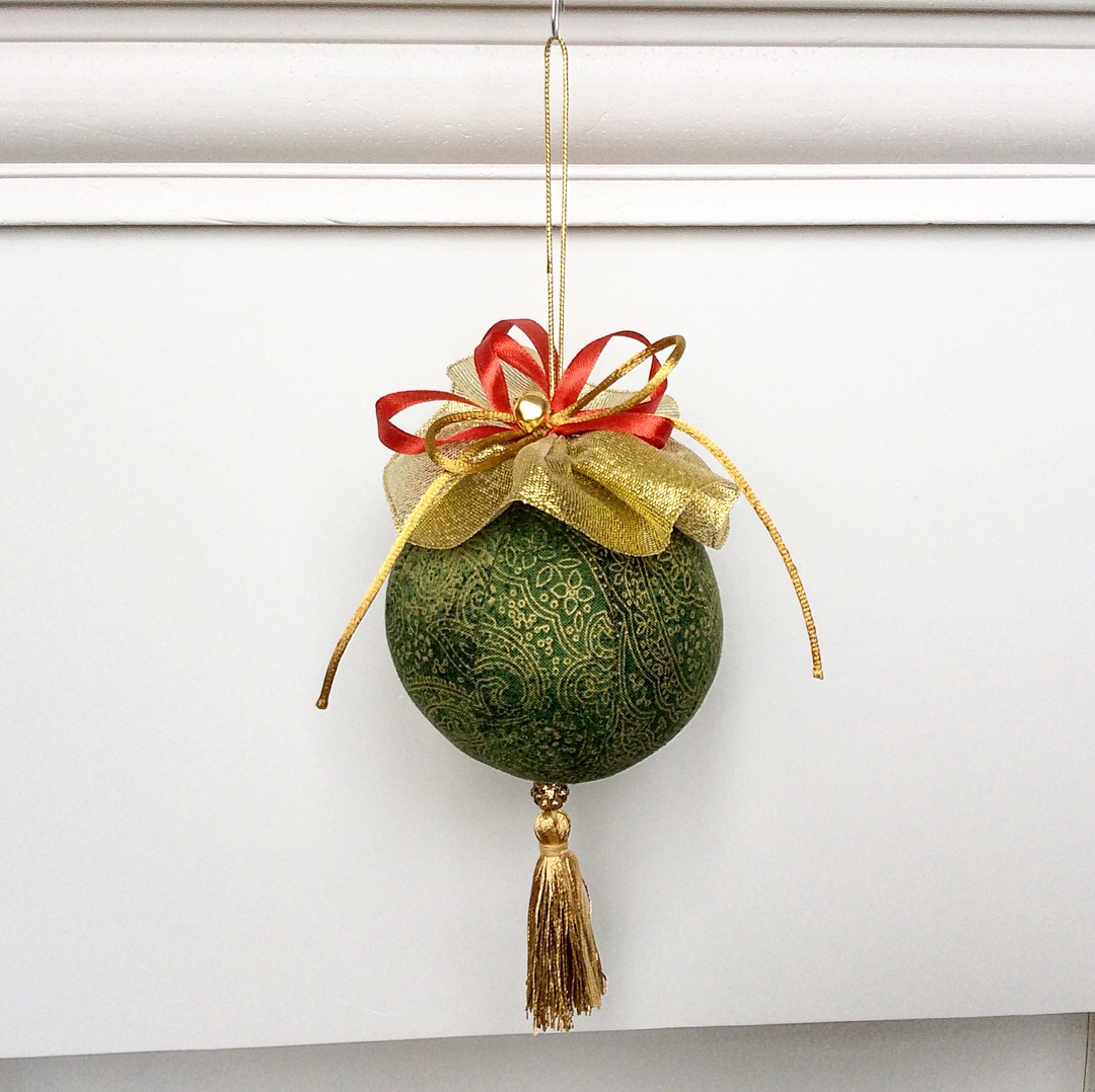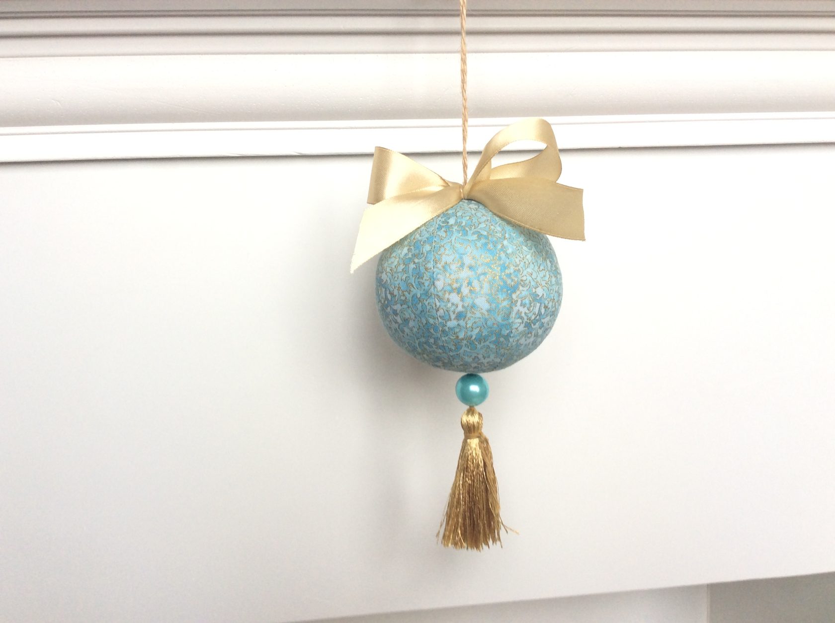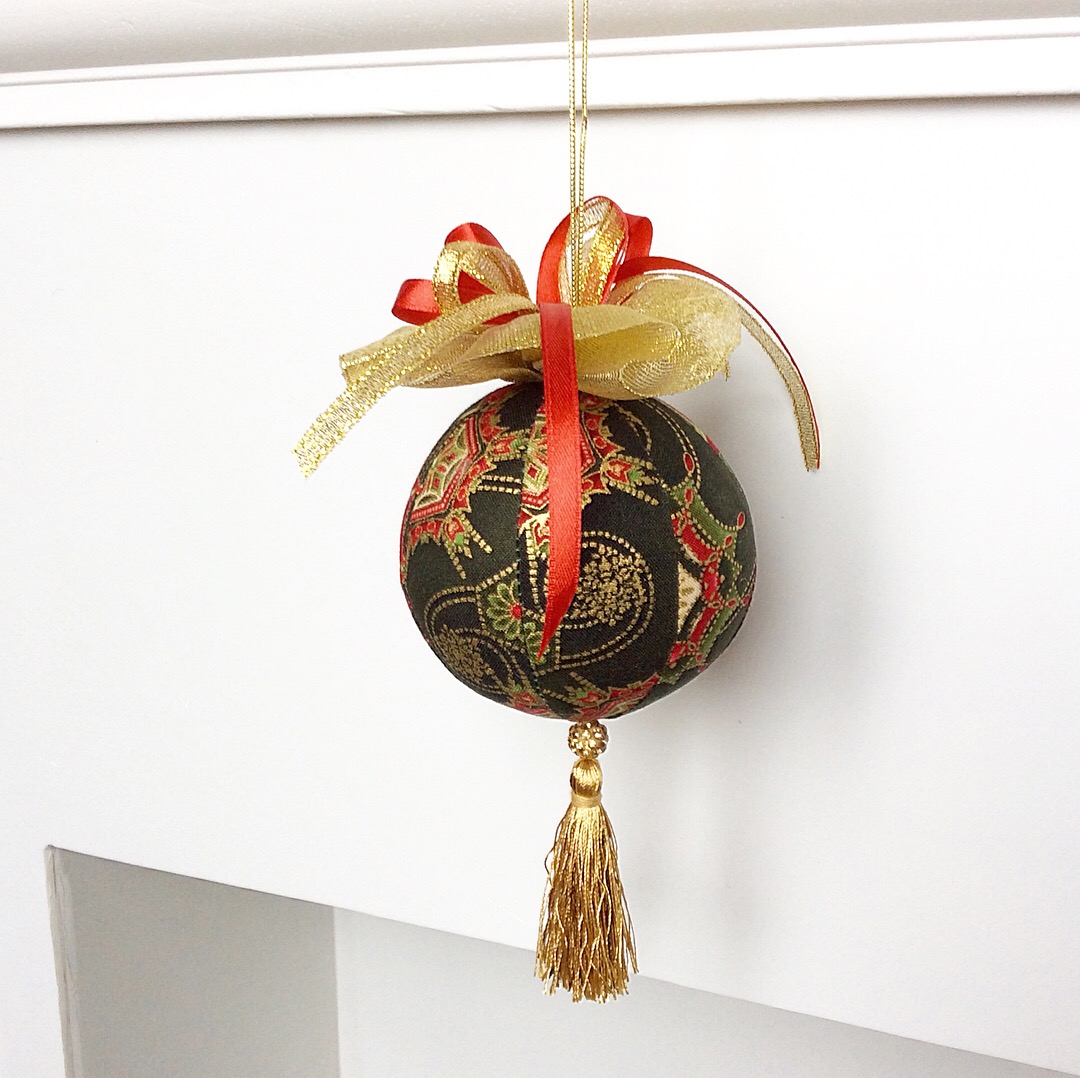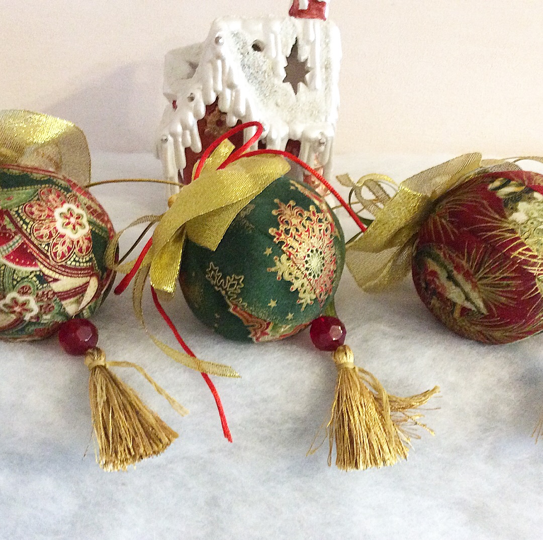 Выполнена из японского хлопка с золотым напылением Украшена: шелковая кисточка, бусина со стразами, колокольчик с лентами Отличное дополнение к Новогоднему декору и в качестве небольшого презента
